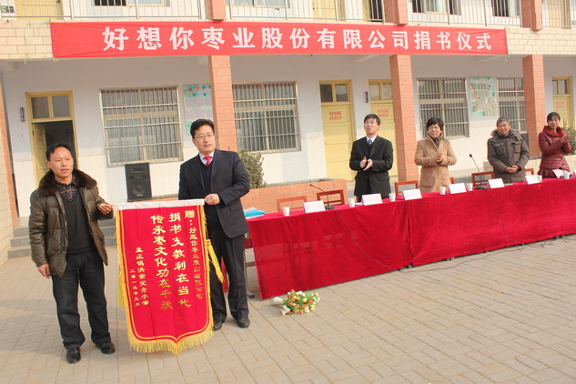 在捐贈儀式上,洪常小學校長馬軍林代表全校師生致感謝詞,現場向好想你棗業贈送了題為“捐書支教利在當代,傳承棗文化功在千秋”的錦旗。好想你棗業行政副總石聚領在捐贈儀式上講話,勉勵孩子們感恩祖國、熱愛家鄉、努力學習,把知識轉化為智慧和能力,為祖國發展和家鄉建設貢獻力量。