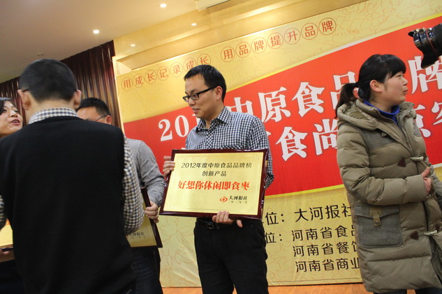 1月30日,由大河報主辦的“2012年度中原食品品牌榜”頒獎盛典在大河錦江飯店舉行。在本屆盛典中,中國紅棗領導品牌——好想你棗業憑借其紅棗產品在行業的絕佳口碑和卓越表現,榮膺“‘2012年度中原食品十大特產品牌’”獎,好想你休閑即食棗榮膺“‘2012中原食品創新產品品牌’”獎,好想你棗業董事長石聚彬榮獲“2012中原食品品牌建設功勛人物大獎”,市場總監鐘輝獲“2012中原食品十大品牌營銷人”殊榮。
