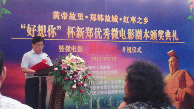 7月15日,由新鄭市人民政府主辦的黃帝故里?鄭韓故城?紅棗之鄉“好想你”杯新鄭優秀微電影劇本頒獎典禮暨新鄭優秀微電影劇本征集活動自4月初征稿以來,收到了來自全國各地微電影愛好者發來的劇本稿件200余篇,經過專家們幾輪緊張的認真評審,最終產生優秀劇本提名獎15個,優秀劇本創作獎5個,最佳劇本創作獎1個。由本次大賽組委會相關領導、嘉賓為獲獎者頒發了獎金、榮譽證書和本次活動獨家贊助者好想你棗業股份有限公司提供的禮品。結合選出來的最佳劇本和專家們的意見,最終決定將微電影的名稱定為《“謎”戀新鄭》。