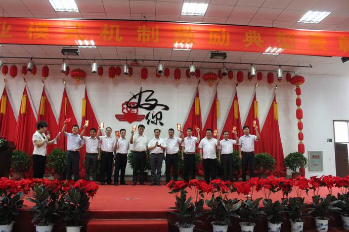 在激動人心的頒獎環(huán)節(jié),月度績效獲獎市場總監(jiān)湛明乾、張永明、王文杰,月度績效獲獎人王魯、劉朝陽、武國鋒,和月度績效前10名省區(qū)經(jīng)理、前10名優(yōu)秀店長、市場一部獲獎單位代表、市場二部獲獎單位代表等,分批登上主席臺,接受了石聚彬董事長頒發(fā)的榮譽和獎金。