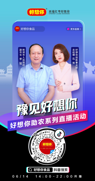 6月14日下午2點,抖音助農扶貧專場走進好想你,屆時新鄭副市長李猛將做客好想你直播間,與好想你創新事業部總經理石芳一道聊聊新鄭的“小城故事”,帶大家領略新鄭的產業活力、人文魅力、美食引力,向全國網友推介新鄭的“源頭好貨”,現場還將送出現金紅包及百元大額券。